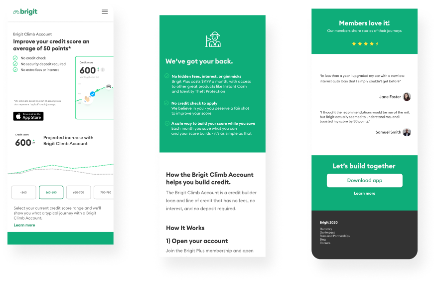 I condensed the copy as best as I could while still explaining sufficiently how the product worked. We had a lot of regulatory constraints, ie: we can't say "we help you open a loan and pay it back for you," because that wouldn't sufficiently prove credit-worthiness to the big 3, so needless to say it was no easy task.
